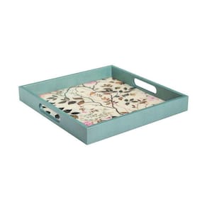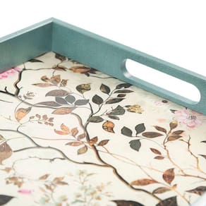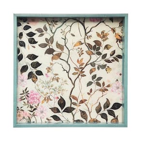 A Bandeja Decor Beija Flor possui 31 x 31 cm e é produzida em plástico e vidro com alças e padronagem de flores e folhagens.