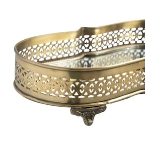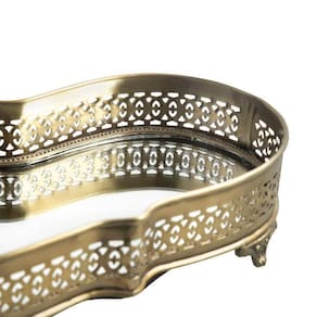 Na cor dourada e com design ovalado os detalhes delicados trabalhados no metal da borda e no pé chamam atenção. O vidro espelhado cria uma aspecto elegante e forma um interessante jogo de imagem quando reflete os obejetos que estão apoiados nele.