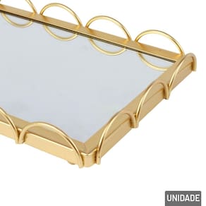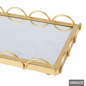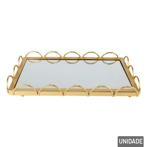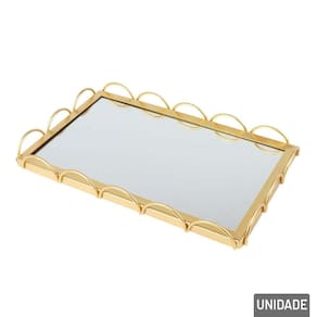 Bandeja Decorativa de Ferro 16x26cm Espelho A Bandeja Decorativa é a escolha perfeita para quem deseja adicionar um toque de sofisticação à decoração. Com estrutura em ferro trabalhado e base espelhada, ela combina charme clássico com modernidade, sendo ideal para organizar e exibir perfumes, velas, joias, cosméticos ou objetos decorativos com requinte e personalidade. Fundo espelhado proporciona um visual luxuoso, ampliando o brilho e destacando os itens colocados sobre a bandeja. Pode ser usada como organizador ou peça de destaque em diferentes cômodos da casa ou escritório. Acabamento refinado e durável, com design elegante que valoriza a decoração do ambiente.\nMarca : C3B Tipo de material : Ferro, MDF, Vidro Cores ou Estampa : Dourado Dimensões do Produto : 3,5 X 26 X 16 CM Peso Bruto (Gramas) : 0.585 Marca: Não Informado