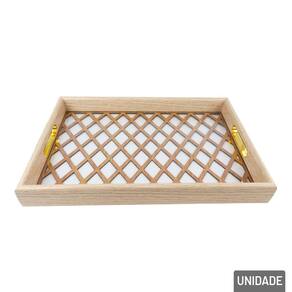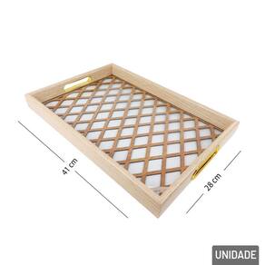 Bandeja Decorativa de MDF 28x41cm Alça Doura A Bandeja Decorativa de 28x41cm é mais do que um item utilitário, é uma peça de destaque na decoração. Com um visual moderno e refinado, ela combina estrutura resistente de MDF, alças de plástico douradas e um fundo transparente de acrílico decorado, criando um produto que une estilo, sofisticação e praticidade.\nFabricada em MDF de alta qualidade, suporta até 12,5 kg, ideal para uso tanto decorativo quanto funcional, seja para servir ou organizar. Garante firmeza no manuseio com um toque de luxo, harmonizando com diferentes estilos de decoração, do clássico ao moderno. Perfeita para lavabos, aparadores, penteadeiras, mesas de centro ou cantinhos do café.\nEspecificações:\nMarca : IMPORIENTE\nTipo de material : Acrílico, MDF, PS\nCores ou Estampa : Bege, Dourado, Transparente\nDimensões do Produto : 4 X 33,5 X 23 CM\nDimensões da Embalagem : 4 X 33,5 X 23 CM\nPeso Bruto (Gramas) : 0.318