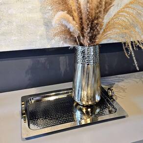 Adicione um toque de glamour e sofisticação à sua decoração com nossa bandeja retangular prateada em inox. Com alças douradas, essa peça se destaca pela elegância e praticidade, perfeita para qualquer ocasião.