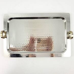 Bandeja retangular prateada em inox Alça dourada Peça de luxo para decoração Glamour e estilo na decoração