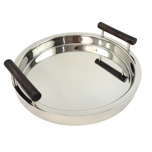 Bandeja Decorativa Inox Prata Com Alça Madeira 32cm Elegância e Versatilidade: Bandeja Redonda Prateada com Alça em Madeira