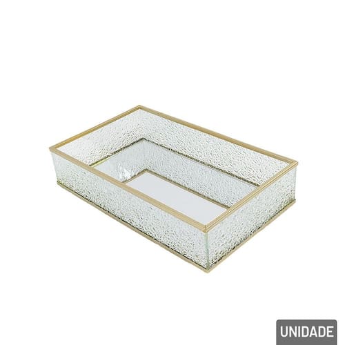 Bandeja Decorativa Metal 24cm Fundo de Espelh A Bandeja Decorativa de Metal Dourado Retangular com fundo de Espelho decorado é a peça perfeita para adicionar um toque de sofisticação e estilo à sua decoração. Com um design elegante e contemporâneo, sua estrutura de metal dourado combina perfeitamente com o fundo de espelho, criando um contraste luxuoso e moderno.