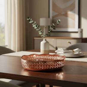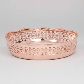 A bandeja decorativa oval em metal cobre rose gold é uma peça charmosa e sofisticada que traz um toque de elegância ao ambiente. Seu design delicado com bordas trabalhadas e acabamento brilhante valoriza a decoração e adiciona requinte à composição.