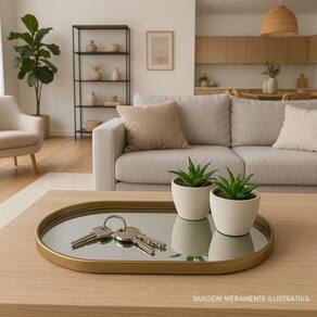 Bandeja Espelhada Decorativa Transforme sua decoração com elegância e praticidade A bandeja espelhada com acabamento dourado traz sofisticação ao ambiente, seja na sala, no hall de entrada ou no quarto. Além de destacar os vasinhos modernos que acompanham, ela também é funcional: perfeita para organizar chaves, acessórios ou pequenos objetos do dia a dia, sem perder o charme. Seu design minimalista e contemporâneo se adapta facilmente a diferentes estilos de decoração, deixando qualquer espaço mais acolhedor e estiloso. Um detalhe simples que faz toda a diferença no visual da sua casa Especificações Técnicas Bandeja Espelhada Material: Polipropileno PP de alta resistência e vidro espelhado Acabamento: Moldura dourada com bordas arredondadas Medidas C x L x A : 30,5 cm x 20,5 cm x 1,5 cm Peso aproximado: 320 g Uso recomendado: Organização de pequenos objetos como chaves, acessórios e cosméticos e decoração de ambientes modernos Adorno - Vasinhos decorativos Material do corpo: Porcelana de acabamento fosco Material de preenchimento: Pedra decorativa natural Material da planta artificial: Policloreto de Vinila PVC e Poliestireno PS de alta durabilidade Medidas A x L : 5 cm x 8 cm cada unidade Peso aproximado cada adorno : 80 g Quantidade: 2 vasinhos inclusos Imagens ilustrativas. Marca: Não Informado