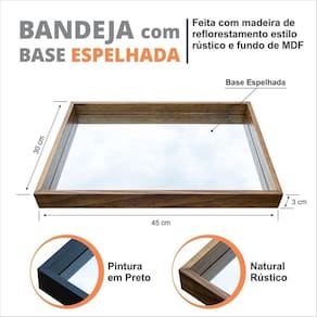 DescriçãoSe você procura uma solução para servir café a seus amigos, clientes ou simplesmente levar frutas para sua mesa de café as bandejas espelhadas da clip são a melhor maneira de fazer isso. Resistentes, lindos, desenvolvidos com madeira de pinos de reflorestamento, possuem um espelho que da uma aparência de luxo ao seu ambiente. Temos nas cores rústicas ou preto. Simplesmente sensacional para impressionar qualquer um no seu redor.Perfeito para aqueles que necessitam de uma bandeja espelhada elegante servindo ou transportando objetos. Destaca-se por seu design rústico e por sua funcionalidadeBeneficio ao dia a dia, tanto em seu ambiente de trabalho ou em casa. Grandes aliados para reinventar a decoração, as bandejas espelhadas são uma opção prática para dar sua própria identidade ao seu ambiente.Cores disponíveisPreto-noire, rústicoEspecificações:Madeira de reflorestamento livre de imperfeições com acabamento pintado.Qualidade premium feito com maquinário de última geraçãoMedidas aproximadas: 3 x 30 x 45 profundidade x altura x largura .Garantia: 3 mêses contra defeitos de fabricação.Despacho em 24 horasEnviamos para todo brasilDireto da fabrica25 anos de experiênciaEmbalagen seguraQualidade comprovadaGarantia de trocaNota fiscalTem alguma dúvdia. Faça-nos uma perguntaLimpeza e cuidados: limpar estrutura com pano levemente umedecido com água, seguido de pano seco. Cuidados: não utilizar produtos químicos ou abrasivos na limpeza. Evitar batidas.Para isso basta navegar por nossos anúncios em mais anúncios do vendedor ou em ver todos os anncios e adicionar ao carrinho os produtos desejados um de cada vez.História clipO suíço, alexander buholzer decidiu quando mais jovem, vir a america do sul. O clima e a recepção dos brasileiros fizeram com que o brasil se destacasse entre os outros países, e , portanto em 1994, escolheu ficar e montar sua empresa nesta linda terra tropical.Alex desde pequeno tinha um grande interesse em guardar todos os retratos da sua família, principalmente, porquê sem estas fotos não existiriam histórias . Assim nasceu a empresa clip juntos com ela todos os seus álbuns, porta retratos e produtos para guardar suas melhores lembranças de vida................