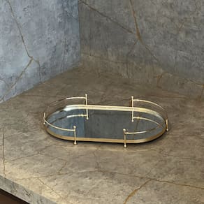 Eleve o charme da decoração com a Bandeja Espelhada Oval Em Metal Dourado Mart. Seu brilho sofisticado e design refinado tornam qualquer espaço mais elegante e convidativo.