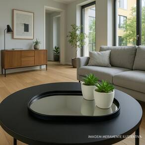 Bandeja Espelhada Decorativa Transforme sua decoração com elegância e praticidade A bandeja espelhada com acabamento dourado traz sofisticação ao ambiente, seja na sala, no hall de entrada ou no quarto. Além de destacar os vasinhos modernos que acompanham, ela também é funcional: perfeita para organizar chaves, acessórios ou pequenos objetos do dia a dia, sem perder o charme. Seu design minimalista e contemporâneo se adapta facilmente a diferentes estilos de decoração, deixando qualquer espaço mais acolhedor e estiloso. Um detalhe simples que faz toda a diferença no visual da sua casa Especificações Técnicas Bandeja Espelhada Material: Polipropileno PP de alta resistência e vidro espelhado Acabamento: Moldura dourada com bordas arredondadas Medidas C x L x A : 30,5 cm x 20,5 cm x 1,5 cm Peso aproximado: 320 g Uso recomendado: Organização de pequenos objetos como chaves, acessórios e cosméticos e decoração de ambientes modernos Adorno - Vasinhos decorativos Material do corpo: Porcelana de acabamento fosco Material de preenchimento: Pedra decorativa natural Material da planta artificial: Policloreto de Vinila PVC e Poliestireno PS de alta durabilidade Medidas A x L : 5 cm x 8 cm cada unidade Peso aproximado cada adorno : 80 g Quantidade: 2 vasinhos inclusos Imagens ilustrativas. Marca: Não Informado