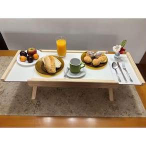 A grande diferença dessa bandeja em relação às demais é a possibilidade de expansão das laterais, proporcionando mais conforto, comodidade e liberdade. Com um espaço 64% maior, você terá muito mais espaço para acomodar um delicioso café da manhã, trabalhar com seu notebook ou estudar com vários livros e cadernos sobre a bandeja.