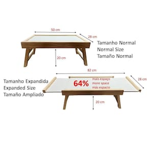 As dimensões da bandeja fechada são de 50 cm de largura x 28 cm de altura, mas ao expandir as laterais, ela chega a 82 cm de largura x 28 cm de altura. Além disso, as pernas possuem um vão de 20 cm de altura, proporcionando um bom espaço para acomodá-las.