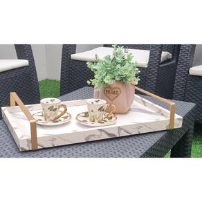 Bandeja para Café / Bandeja para Bebidas Marmorizada Luxo A Bandeja Decorativa para café ou para bebidas, leva luxo conforto e sofisticação para seu lar.Seu tamanho é sufuciente para acondicionar diversos ítens, facilitando e organizando o dia a dia.Pode ser utilizada sobre o aparador, mesa de centro, rack, armários, cristaleiras ou em algum movel que necessite de um toque de sofisticação e elegância.A bandeja para bebidas ou café também pode ser utilizada como uma linda peça decorativa, ela possui duas alças na cor Gold/Rosê.Solte a sua criatividade para decorar seu ambiente e se prepare para receber muitos elogios pelo seu bom gosto em adquirir essa linda bandeja decorativa marmorizada.