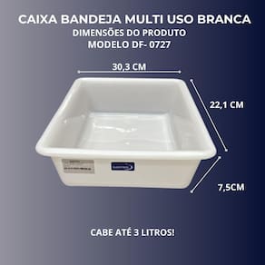 Caixa Bandeja Multi uso branca 3 litros A bandeja de polipropileno Bioprátika Multi uso é um item indispensável para qualquer estabelecimento, seja ele uma cozinha doméstica ou industrial, refeitórios, padarias, pastelarias, lanchonetes ou mercados. Confeccionada em plástico polipropileno, esta bandeja não contém bisfenol, tornando-a uma opção segura e saudável para o armazenamento de alimentos. Com medidas externas aproximadas de 30,3 cm de comprimento, 22,1 cm de largura e 7,5 cm de altura, a bandeja é retangular, o que facilita o armazenamento e organização. O modelo DF-0727, da marca daifpro, é versátil e funcional, sendo ideal para armazenar carne, peixe, frango, , legumes, frutas e até mesmo objetos. Além disso, a bandeja é apta para uso em lava-louças, o que facilita a limpeza e manutenção Diária. No entanto, não possui pés dobráveis. A bandeja de polipropileno Bioprátika Multi uso é perfeita para uso em freezers e microondas, tornando-a uma opção prática e eficiente para o dia a dia. ESPECIFICAÇÕES Comprimento: 30,3cm Largura: 22,1cm Altura: 7,5cm Capacidade: 3 Litros