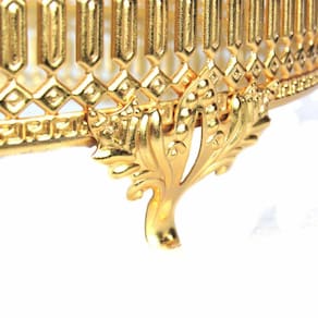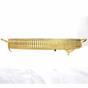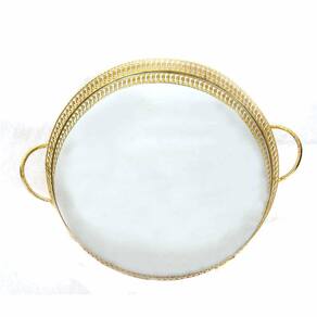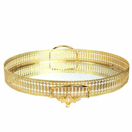 Feita com materiais de alta qualidade, esta bandeja possui um acabamento dourado brilhante que reflete a luz de maneira impressionante. Seu design sofisticado e minimalista a torna versátil, permitindo que você a utilize como um elegante centro de mesa, suporte para velas ou para exibir itens de decoração preciosos.