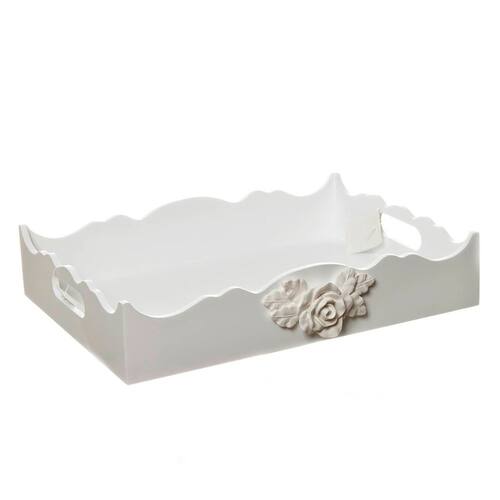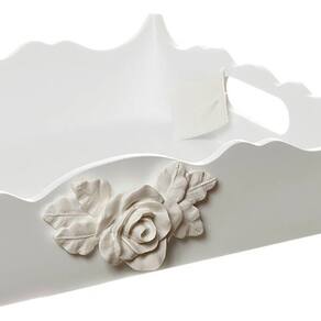 Organizese com essa bandeja confeccionada, especialmente, para levar praticidade e versatilidade para as mamães e com muito estilo. Afinal toda a magia da ambientação se manifesta através desses toques decorativos, que não podemos abrir mão Dados Técnicos Bandeja em madeira MDF, pintura laqueada e decoração em resina branca. Medidas Largura: 26 cm Comprimento: 35 cm Altura: 7 cm
