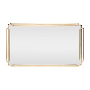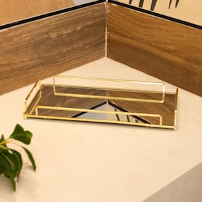 A Bandeja Retangular Dourada em Metal com Espelho Royal (34x16cm) da Wolff é um objeto de decoração refinado, desenhado para adicionar luxo e funcionalidade a diferentes ambientes. A peça destaca-se pela sua estrutura em metal dourado e base espelhada, sendo ideal para organizar perfumes, maquiagens, bebidas ou servir como ponto focal em aparadores e mesas de centro.
