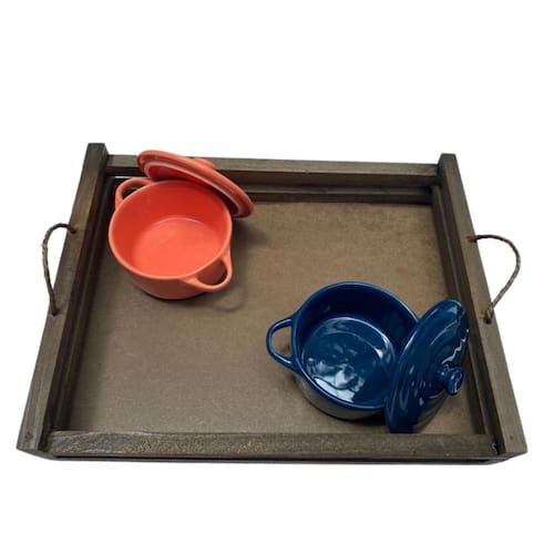 Bandeja Rustica com 2 panelinhas de porcelana - Vai ao Forno Duas Mini Caçarolas de porcelana que podem ir ao forno com uma bandeja rustica.