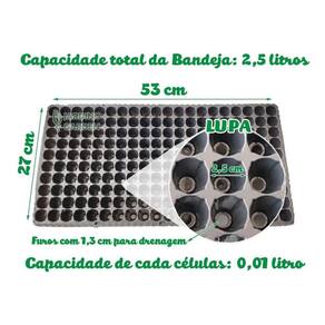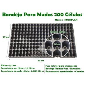 Bandeja / semeadeira para mudas com 200 células.Marca : nutriplanUtilizadas com pleno êxito no cultivo de diferentes tipos mudas.Ideal para mudas de hortaliças, ornamentais, aromáticas e culturas diversas.Medidas:Comprimento: 53 cmLargura: 27 cmAltura: 4,2 cmCapacidade : 2,5 litrosMedida de cada célula:Diâmetro da célula: 2,5 cmFuro da célula : 1,3 cmAltura da célula: 4,2 cmCapacidade de casa célula: 12,5 ml