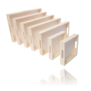 - 🌿 Telas em branco prontas para artesanato: sete bandejas de madeira inacabadas em tamanhos graduados (16 × 10,25 × 1,5 ?; 15,3 × 9 × 1,5 ?; 14,5 × 8,25 × 1,4 ?; 13,75 × 7,5 × 1,3 ?; 13 × 6,6 × 1,25 ?; 6 × 6 × 6 × 1 ?; 6 × 6 × 1 ?; 6 × 6 × 1 ?) convide a pintura, coloração, decupagem ou queima de madeira.