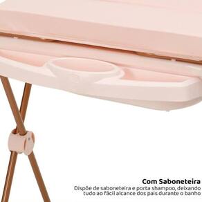 Características Técnicas do Produto: Capacidade máxima da banheira bebê + água = 20kg. Banheira 2 em 1: O tanque pode ser utilizado no suporte ou fora. Saboneteira com porta objetos acoplados no suporte da banheira. Mangueira para saída de água do tanque. Tampo-trocador almofadado com proteção lateral. Fácil limpeza. Ideal para banheiros pequenos, possui pernas alongadas, encaixa perfeitamente em cima do vaso sanitário. Redutor para banho. Modelo: Classic. Cor: Rose. Marca: Galzerano.
