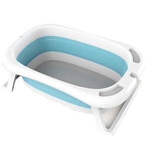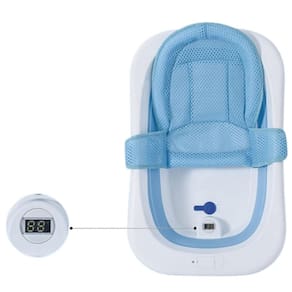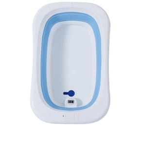 Banheira Para Bebe Dobrável Portátil Com Medidor de Temperatura e Rede Cor: Azul Ótima para pequenos espaços e apartamentos, ela é desmontável e pode ser guardada em diversos locais.