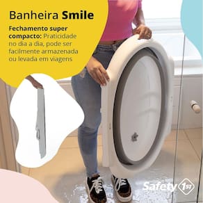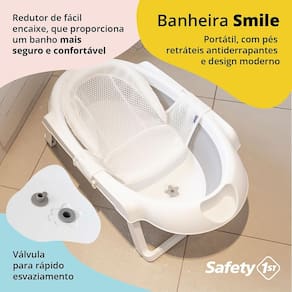 A Banheira Smile da Safety 1st foi criada para aquele momento delicioso e refrescante do banho seja repleto de alegria para o bebê, com a tranquilidade que os pais precisam, desde o primeiro banho, proporcionada pelo redutor que traz confiança e mais segurança para a realização desta tarefa. O redutor foi confeccionado em tela, macio e de secagem rápida, tem encaixe super fácil, para maior praticidade no uso diário. Falando em praticidade, possui saboneteira, válvula para esvaziamento, feita em borracha macia e o fechamento compacto tanto para armazenar em pequenos espaços ou levar, o que torna a Smile a companheira inseparável do seu bebê.