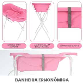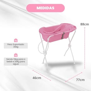 Características Destacadas: - Cor: Rosa elegante, combinando com qualquer decoração de banheiro. - Estrutura Robusta: Feita com aço tubular Ø3/4" e acabamento em pintura epóxi/poliéster, garantindo durabilidade e estabilidade. - Material de Alta Qualidade: Banheira de plástico de engenharia PP (polipropileno), seguro e fácil de limpar. - Mangueira de Escoamento: Facilita a remoção da água após o uso, tornando a limpeza simples e rápida. - Capacidade: Suporta até 30Kg, permitindo o uso desde recém-nascidos até crianças de 2 anos.
