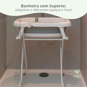Características do Produto: Alta Capacidade: Comporta até 35 litros de água, uso direto no chão, ideal para um banho relaxante. Uso com ou sem suporte: adaptável a diferentes espaços e fases Almofada ergonômica com 3 alças ajustáveis: mais conforto e apoio para o recém-nascido Estrutura dobrável: compacta, leve e fácil de guardar Tampa de drenagem com sensor térmico: muda de cor com a água quente Porta-sabonete integrado: praticidade durante o banho Mangueira para escoamento da água com facilidade Suporte dobrável com pés antiderrapantes e trava de segurança Superfície interna lisa: fácil de higienizar Design moderno e funcional