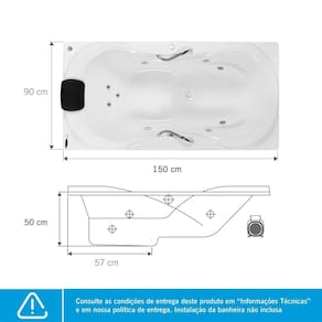 Descubra o verdadeiro significado do relaxamento com a Banheira de Hidromassagem Due da Astra. Esta banheira combina funcionalidade elegante, conforto supremo e terapia de hidromassagem, proporcionando uma experiência de hidromassagem exclusiva no conforto de sua casa. Posição do Motor: Posição 1 Aba Lateral: Não Aba para pés: Não Acionamento Pneumático: Sim Acompanha Aquecedor: Com Aquecedor Acompanha Manual de Instalação: Sim Acompanha Motobomba: 01 Air Blower: Não Alças de Apoio: 02 Altura: 50 cm Ambiente: Banheiro;Interno Ambiente Principal: Banheiro Apoio de Cabeça: 01 Cascata: Não Certificado: Certificadas de acordo com as normas IEC 60335-1 e 60335-2-60, conforme a Portaria INMETRO n° 148/2022. Comprimento: 150 cm Cor: Branco Cromoterapia: Opcional Dispositivo de Sucção: 02 Ducha com desviador: Não Entrada de Água: Sim Entrada de Ar: Sim Formato: Retangular Informações Complementares: Reforçado com fibra de vidro. Acomoda uma pessoa.Possui fundo plano com piso antiderrapante. Capacidade: Importante seguir o volume Ideal para não transbordar Kit Hidráulico: Sim Largura: 90 cm Litros: 105 Localização do Motor no Desenho Técnico: Cabeceira Manual de Montagem e Instalação: https://product-hub-prd.madeiramadeira.com.br/907644/documents/5200a9fe-71e7-4abd-8ef1-7b8fb00a32c94ab8476db5fc1688571imersao.pdf Necessita Instalação: Sim Origem do Produto: Nacional Peso: 29,9137 kg Possui Pés: Não Potência da Motobomba: HP Potência do Aquecedor: 5000 Quantidade de Jatos da Hidromassagem: 04 Quantidade de Lugares: 01 Quantidade de Minijatos: 03 Recomendações de Uso, Manutenção e Limpeza: Para banho, relaxamento e tratamentos terapêuticos.Para limpeza, utilize flanela e sabão/detergente neutro.NUNCA UTILIZE: produtos a base de álcool, cloro ou amônio. Produtos abrasivos (tipo sapólio, esponja de aço etc). Solvente (tipo acetona, benzina, éter etc).Para manter o brilho da peça utiliza: flanela e lustra móveis. Sistema de Som: Não Sistema instala fácil: Não Tubulação de Água e Ar: Sim Válvula de saída de água: Sim