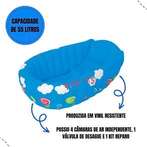 Características Técnicas: Material: PVC Formato: Oval Idade recomendada: A partir de 1 ano até 3 anos Cor predominante: Azul. Capacidade: 55 litros
