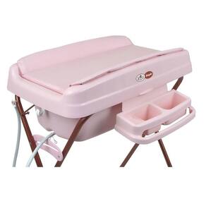 Suporte com travas em arco Tampo plástico com trocador acolchoado Saboneteira com porta-toalha Mangueira para escoamento da água Acompanha assento redutor de profundidade para recém-nascidos.