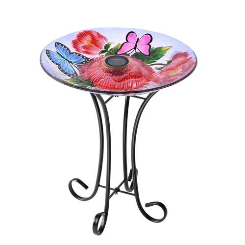 Banheira solar LED para pássaros de vidro floral Hi Line Gift Ltd., com suporte — borboletas e peônias, multicolorida (78415-L)