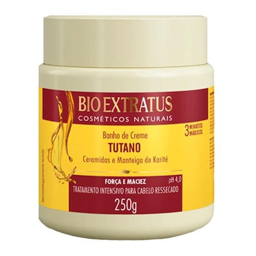 Linha Tutano - Força e Maciez Pioneira no uso do tutano em cosméticos capilares, a Bio Extratus desenvolveu uma linha completa para dar mais força e maciez. Indicação: Cabelo ressecado. Função: Limpar com suavidade, nutrir e hidratar intensamente. Resultados e Benefícios: Protege os fios, tornando-os mais saudáveis, macios e brilhantes. Ativos Karité: Previne o ressecamento dos cabelos. Protege das agressões mecânicas e climáticas, inclusive dos raios ultravioleta. Tutano: Rico em proteínas, nutre e fortalece profundamente o cabelo, hidratando e protegendo das agressões externas. Ceramidas: Restaura os cabelos danificados por condições estressantes, aumenta o brilho, a elasticidade e a resistência dos fios. Silicone: Confere brilho, proteção e sedosidade, proporcionando aparência saudável e natural ao cabelo. Queratina Vegetal Catiônica: Intenso poder de restauração. Banho de Creme Tutano Proteínas para hidratar, nutrir e fortalecer os cabelos. Enriquecido com de karité, que protege dos danos causados por agentes externos. Tem ação emoliente, contribuindo para a redução das pontas duplas em cabelos secos, desvitalizados e envelhecidos. Ph 4,0.