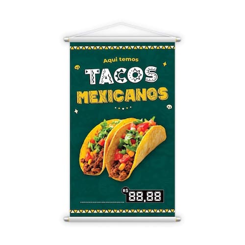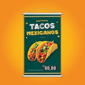 O design do banner é vibrante e colorido, com a frase Aqui Temos Tacos Mexicanos em letras grandes e chamativas, acompanhada de ilustrações que evocam a rica cultura mexicana. As cores são cuidadosamente escolhidas para transmitir a alegria e a autenticidade da gastronomia mexicana, tornando-o não apenas um sinal, mas também uma peça decorativa que enriquece o ambiente.