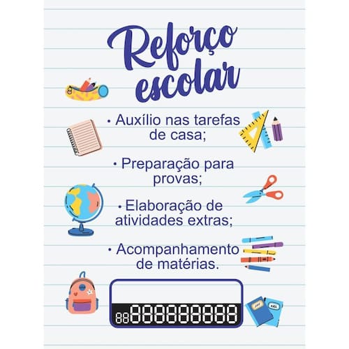 Banner Arte Pronta - Reforço Escolar A arte é a imagem do anúncio. Promova e divulgue seu produto com qualidade. Banners temáticos de produtos e serviços para atrair a atenção de seus clientes. Especificações: Material: lona Acabamento: e corda. Tamanho: 60x80cm Uso: interno e externo. Material impresso em alta qualidade com cores viva Informações complementares: Não alteramos a arte deste produto, a arte é a imagem que está sendo anunciada. Marca: Não Informado