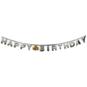 - Birthday banner features a silver "Happy Birthday" message in metalwork style lettering separated by a dump truck image
