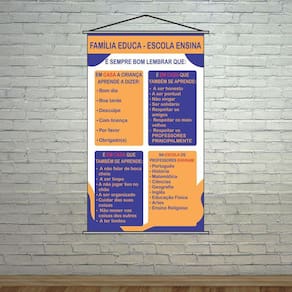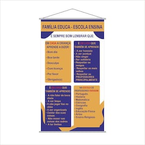 TAMANHO:Banner com medida total de 120x65cmACABAMENTO:Bastões de madeira + corda na parte superior.Atualmente existem diversas formas de aprendizado e a modernidade facilita e ajuda no desenvolvimento de cada passo escolar e pedagógico de uma criança. O banner pedagógico é uma delas, uma ótima forma de incentivar e começar a trabalhar a mente e praticar o aprendizado.Desenvolvemos diversos modelos de banners e cada um deles oferece apoio e ajuda no desenvolvimento em várias áreas.Quer ajudar os seus alunos a desenvolver esses aprendizadosOs Banners Pedagógicos são excelentes para trabalhar de uma forma interativa o desenvolvimento dos alunos, facilitando na hora de ensinar e memorizar cada passo.
