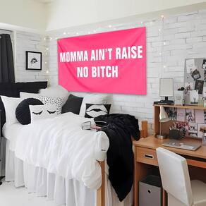 1 - Material de la bandera divertida para habitación: Las banderas "Momma aint raise no bitch" para habitación están hechas de poliéster suave y duradero de alta calidad, impermeable y con revestimiento resistente a los rayos UV, por lo que su uso prolongado no desvanecerá la bandera. - Tamaño: La bandera "Momma aint raise no bitch" para adolescentes mide 91x152 cm (3x5 pies) y cuenta con 2 anillas de cobre sólido. - La bandera rosa "Momma Aint Raise No Bitch" es simple y sofisticada, tiene diseño doble cara con impresión espejo visible en ambos lados, los colores son muy vivos, perfecta para sala, dormitorio, dormitorio de adolescentes, llamando fácilmente la atención. - Regalo Único: Puedes regalarla a familiares y amigos en Día de San Valentín, Acción de Gracias, Halloween, fiestas, inicio de clases, Navidad, Año Nuevo, o colgarla en la pared del dormitorio. - Nuestro póster "Momma Aint Raise No Bitch" facilita su instalación y remoción. La tela ligera y fluida permite que ondee aún con brisa ligera, para mostrarla con orgullo en el exterior.