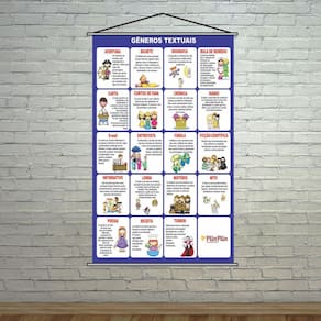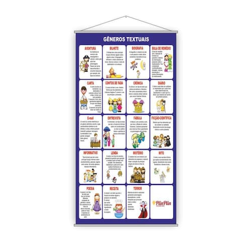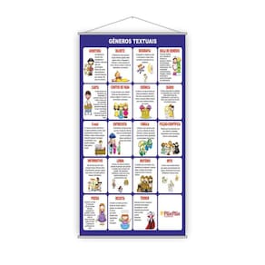 Banner Pedagógico Escolar Gêneros Textuais 80X50Cm TAMANHO: Banner com medida total de 80x50cm ACABAMENTO: Bastões de madeira + corda na parte superior. Atualmente existem diversas formas de aprendizado e a modernidade facilita e ajuda no desenvolvimento de cada passo escolar e pedagógico de uma criança. O banner pedagógico é uma delas, uma ótima forma de incentivar e começar a trabalhar a mente e praticar o aprendizado. Desenvolvemos diversos modelos de banners e cada um deles oferece apoio e ajuda no desenvolvimento em várias áreas. Quer ajudar os seus alunos a desenvolver esses aprendizados Os Banners Pedagógicos são excelentes para trabalhar de uma forma interativa o desenvolvimento dos alunos, facilitando na hora de ensinar e memorizar cada passo.