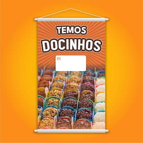 Este banner "Temos Docinhos" é a solução perfeita para confeiteiros e doceiros que desejam anunciar seus deliciosos doces e atraírem a atenção de seus clientes. Com um tamanho generoso de 80x50cm, este banner é grande o suficiente para ser exibido de maneira proeminente em sua loja, estande de vendas ou evento.