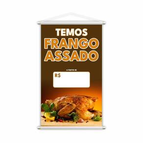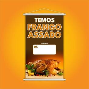Banner Temos Frango Assado Preço Fundo Branco GrandeTAMANHO:Banner com medida total de 120x60cmACABAMENTO:Bastões de madeira + corda na parte superior.