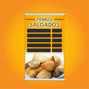 A combinação da lona de 340g com os bastões de madeira e a corda na parte superior faz do Temos Salgados um item decorativo que não só embeleza o espaço, mas também oferece durabilidade e resistência. Perfeito para ambientes que buscam um estilo descontraído, rústico ou industrial, esse banner é uma excelente opção para quem deseja dar um charme a mais em seu ambiente, com um toque especial e acolhedor.