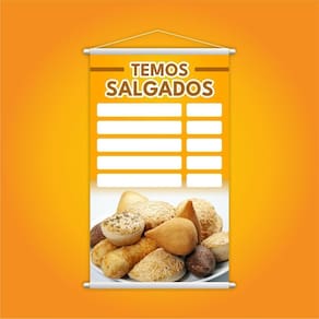 A combinação da lona de 340g com os bastões de madeira e a corda na parte superior faz do Temos Salgados um item decorativo que não só embeleza o espaço, mas também oferece durabilidade e resistência. Perfeito para ambientes que buscam um estilo descontraído, rústico ou industrial, esse banner é uma excelente opção para quem deseja dar um charme a mais em seu ambiente, com um toque especial e acolhedor.
