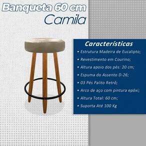 Características do Produto: - Base do assento e fundo Mdf e Mdp de 15MM; - Altura para apoio dos pés: 20 cm; - Altura do Assento: 10 cm; - Parte inferior acabamento em TNT preto; - Estrutura em madeira de eucalipto; - Arco em aço, com pintura especial epóxi; - Suporta uma pessoa até 100 kg; - Garantia 3 meses por nós fabricantes; - Formato Redondo; - Espuma do Assento D-23; - 3 Pés Palito Retrô; - 3 Chapas de Aço Galvanizado para fixação dos pés; Dimensões do produto montado: - Altura: 60 cm; - Largura: 37 cm; - Comprimento: 37 cm; Observações importantes: Para assegurar que sua banqueta mantenha sua durabilidade e beleza ao longo do tempo, siga estas recomendações: 1 - Limpeza: Use pano úmido com sabão neutro, evitando abrasivos. 2 - Proteção Solar: Evite sol direto para prevenir desgaste. 3 - Umidade: Seque imediatamente em caso de derrames. 4 - Uso Adequado: Respeite a capacidade de peso indicada e não faça movimentos perigosos em cima da banqueta. 5 - Manutenção: Inspecione periodicamente e limpe conforme instruções acima. 6 - Armazenamento: Local limpo e seco, protegido de poeira e umidade, não expor ao sol e chuva.