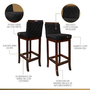 Apresentamos a banqueta Nice, feita com madeira maciça de reflorestamento e acabamento em verniz. Seu assento preenchido com espuma D26 e encosto com espuma D23 garantem conforto duradouro. O encanto adicional vem da costura matelassê no encosto, enquanto o revestimento em suede adiciona uma sensação de luxo. Adapta-se perfeitamente a qualquer espaço, adicionando elegância e conforto instantaneamente. CARACTERÍTICAS TÉCNICAS: - Produzido em Madeira Maciça de Reflorestamento; - Acabamento em Verniz na cor Castanho; - Assento Preenchido com Espuma D26; - Encosto Preenchido com Espuma D23; - Encosto com Costura Matelassê; - Revestimento em Suede na cor Preto. *Indicada para Bancadas/Mesas com Alt. 100/105 cm. *PRODUTO ENVIADO MONTADO. INFORMAÇÕES TÉCNICAS: Altura Total: 102 cm Altura até Assento: 75 cm Altura até Travessa: 23 cm Altura Encosto: 35 cm Largura Assento: 38 cm Largura Estrutura: 36 cm Profundidade Total: 42 cm Profundidade Assento: 41 cm Peso: 7 kg INFORMAÇÕES ADICIONAIS:ATENÇÃO: Móvel produzido em madeira maciça natural podendo ocorrer mudança no tom da madeira conforme o produto;*Conferir se o produto está de acordo com o que comprou, produto danificado não será aceito troca;**As imagens ambientadas são meramente ilustrativas e podem apresentar itens que não compõe o produto. As cores do produto podem variar de acordo com o monitor, a iluminação do ambiente ou sua percepção visual;***Limpeza deve ser feita com pano macio e seco ou levemente umedecido com água e sabão neutro. Não devem ser utilizados abrasivos como palha de aço e objetos cortantes;Garantia para defeitos de fabricação conforme Código de Defesa do Consumidor. Marca: CCS Interiores