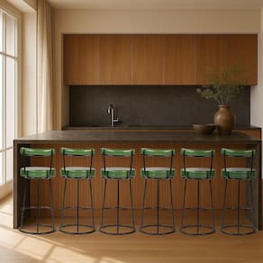 Banqueta Alta Cozinha 70cm Encosto Industrial Aço Kit 6 Ziria Pu S02 - D'rossi Cor Verde Transforme sua cozinha, área gourmet ou espaço comercial com o kit 6 Banquetas Altas Ziria. Com 96 cm de altura e 70 cm do assento ao chão, é perfeita para bancadas, ilhas e mesas altas, tornando-se ideal para ambientes residenciais como cozinhas e áreas de lazer, e também para estabelecimentos como cafeterias, bares e lanchonetes. A estrutura é fabricada em aço carbono com pintura epóxi preta, que garante durabilidade e resistência contra corrosão, enquanto o assento e o encosto fixos são estofados em espuma D-28 de alta densidade, oferecendo conforto prolongado. O revestimento em sintético PU, além de ser sofisticado, é durável, impermeável e fácil de limpar. Seu design moderno inclui base vazada em arco com hastes curvas, que une leveza visual e robustez. Além disso, conta com apoio para os pés integrado e suporta até 140 kg com segurança. A escolha ideal para quem deseja unir elegância, praticidade e conforto em qualquer espaço! Dimensões do Produto: Altura: 96 cm Largura: 38 cm Profundidade: 38 cm Peso: 36 kg Outras medidas: Altura para apoio dos pés: 24 cm Altura do Assento até o Chão: 70 cm Especificações do Produto: Material da Estrutura: Aço Carbono e Madeira de reflorestamento (eucalipto seco) evitando fungo e mofo. Material do Arco, bases e encosto: Aço Carbono Base do Assento: MDF e MDP de 15 mm Peso Suportado: Até 140 Kg sem impacto Acabamento: Pintura epóxi Revestimento do Assento: Sintético PU (Tecido Impermeável) Tipo de Assento: Fixo Possui Almofada no Assento: Sim, Fixa Material do Assento: Almofada com Espuma Enchimento do Assento: Espuma D-28 Possui Encosto: Sim Tipo de Encosto: Fixo Material do Encosto: Estrutura metálica e acabamento estofado no mesmo material do assento. Possui Pés: Sim Tipo de Pés: Base estilo arco Possui apoio de pés: Sim É Giratória: Não Possui Apoio para Braços: Não Possui Altura Regulável: Não Possui Rodízios: Não Diferenciais: Design Industrial; Base com ponteiras em PU; Grampos galvanizados na montagem e tapeçaria. Manual de Montagem: Acompanha manual e todos os acessórios para montagem. Complexidade da Montagem: Baixa Montagem: Necessita apenas a fixação do assento com parafusos. Garantia: 90 dias contra defeito de fabricação Instruções de Limpeza: Utilizar um pano limpo e levemente úmido Quantidade de Volumes: 3 Caixas Medida das Embalagens: Caixa 1: 86x45x45 cm; Caixa 2: 86x45x45 cm; Caixa 3: 86x45x45 cm Entrega: É feita somente até o térreo ou portaria. Confira sempre as medidas das embalagens para assegurar que o produto passe por portas e escadas do local.