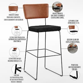 O espetáculo que é a Banqueta Alta Cozinha Sala Jantar Fixa Allana L02 Couríssimo Camel Linho Chumbo - Lyam Decor vem para agregar ainda mais valor na decoração da sua casa. Sua estrutura em aço remete-nos ao estilo industrial que surgiu em Nova York no século XX, já o assento e encosto estofados trazem equilíbrio e conforto criando a combinação perfeita para o ambiente.