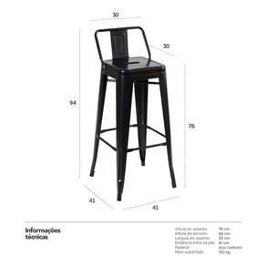 Dimensões da Banqueta: Altura do assento: 76 cm Altura total (com encosto): 94 cm Largura do assento: 30 cm Profundidade do assento: 30 cm Distância entre os pés: 41 cm Observações Importantes: Produto enviado montado Garantia de 3 meses contra defeitos de fabricação As cores podem sofrer variação conforme iluminação e tela