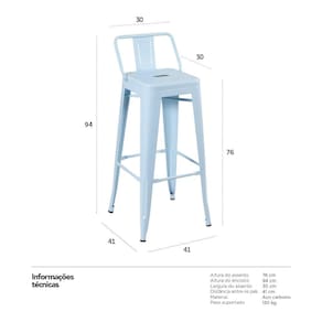 Banqueta modelo Iron Tolix. Altura do assento: 76 cm - Altura do encosto: 94 cm - Largura do assento: 30 cm - Distância entre os pés: 41 cm - Material: Aço carbono - Peso suportado: 130 kg - Garantia: 3 meses.
