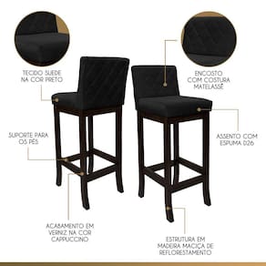A banqueta Tóquio é a fusão perfeita entre requinte e comodidade. Fabricada com madeira maciça proveniente de reflorestamento e acabamento em verniz, sua estrutura promove durabilidade e um charme natural. O assento, preenchido com espuma D26, e o encosto, com espuma D23, proporcionam um suporte ergonômico incomparável. O toque de elegância é evidenciado pelo detalhe da costura matelassê no encosto, enquanto o revestimento em suede adiciona um acabamento luxuoso. A banqueta Tóquio é a escolha ideal para elevar o conforto e a sofisticação de qualquer ambiente. CARACTERÍTICAS TÉCNICAS: - Produzido em Madeira Maciça de Reflorestamento; - Acabamento em Verniz na cor Capuccino; - Assento Preenchido com Espuma D26; - Encosto Preenchido com Espuma D23; - Encosto com Costura Matelassê; - Revestimento em Suede na cor Preto. *Indicada para Bancadas/Mesas com Alt. 100/105cm. *PRODUTO ENVIADO MONTADO. INFORMAÇÕES TÉCNICAS: Altura Total: 100 Cm Altura até Assento: 75 Cm Altura até Travessa: 23 Cm Altura Encosto: 35 Cm Largura Assento: 38 Cm Largura Estrutura: 36 Cm Profundidade Total: 42 Cm Profundidade Assento: 41 Cm Peso: 7 kg INFORMAÇÕES ADICIONAIS: ATENÇÃO: Móvel produzido em madeira maciça natural podendo ocorrer mudança no tom da madeira conforme o produto. *Conferir se o produto está de acordo com o que comprou, produto danificado não será aceito troca. **As imagens ambientadas são meramente ilustrativas e podem apresentar itens que não compõe o produto. As cores do produto podem variar de acordo com o monitor, a iluminação do ambiente ou sua percepção visual. ***Limpeza deve ser feita com pano macio e seco ou levemente umedecido com água e sabão neutro. Não devem ser utilizados produtos abrasivos. Garantia para defeitos de fabricação conforme Código de Defesa do Consumidor. Marca: CCS Interiores